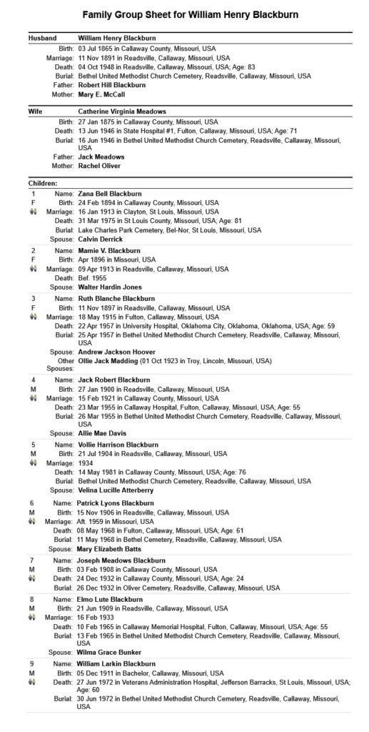 The dad, William Henry Blackburn was a grandson of Robert Henry McCall and Elizabeth Middleton Gilbert and great-grandson of William S. McCall and Mildred Holland. William Henry Blackburn was a 2nd cousin of our ancestor Zelpha Lou McCall. William and Kate’s children were third cousins of our ancestor Thomas Leland Estes. The Blackburns lived their lives in Callaway County Missouri, so it is likely that our people knew them or at least knew of them.